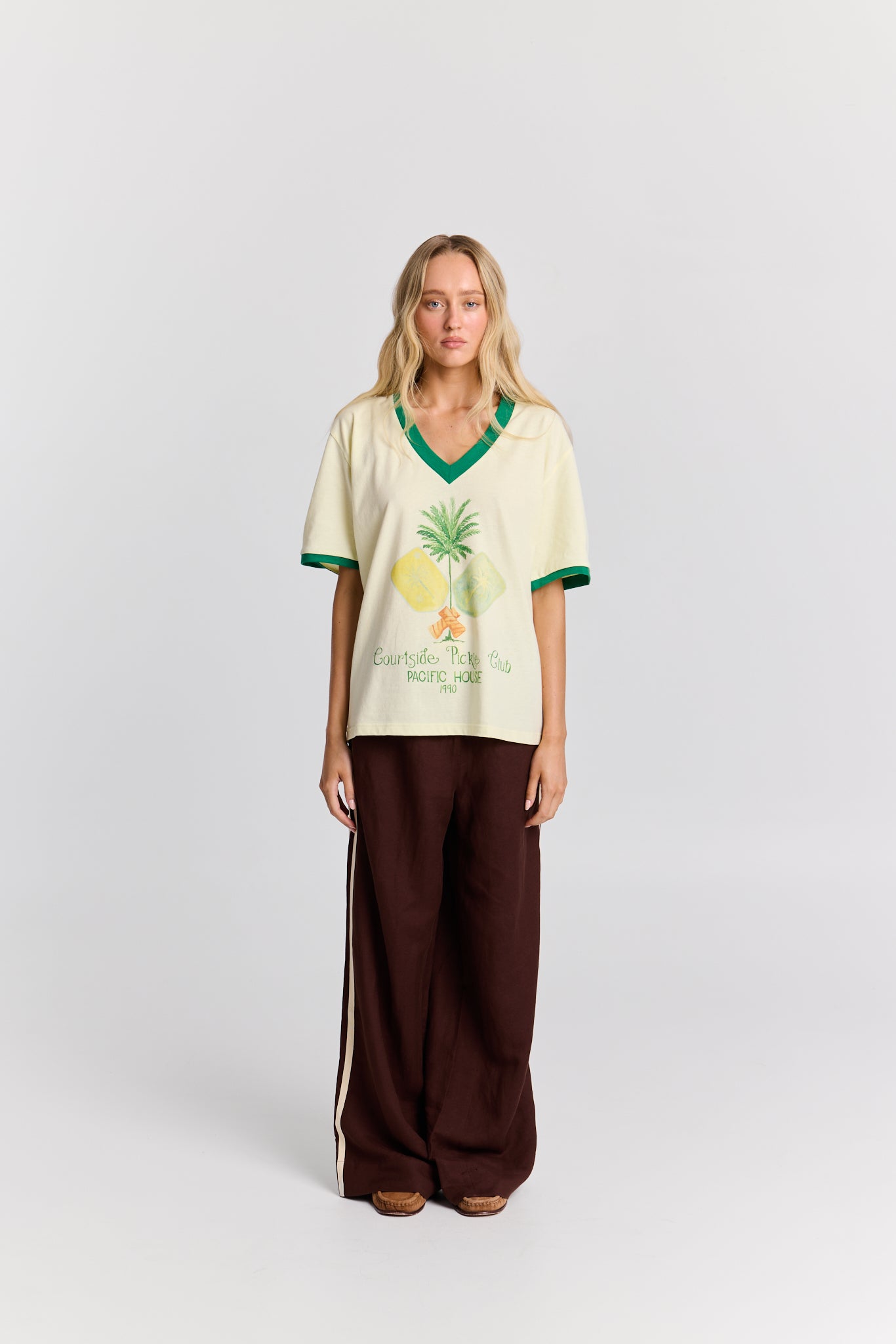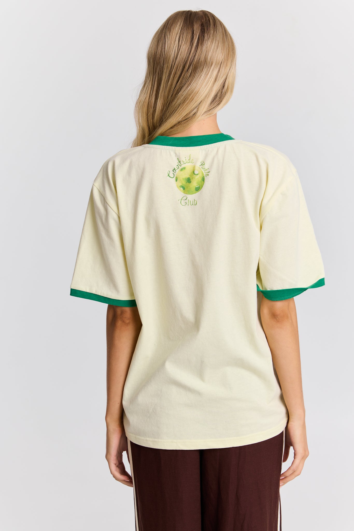Serve looks on and off the court in the Pickleball V-Neck Tee. Featuring a playful pastel graphic and “Courtside Pickle Club” insignia, this relaxed v-neck regular fit tee is crafted in soft-touch cotton for ultimate wearability. Designed in a sweet powder pink with contrast Prism Pink ribbing, it’s a love letter to low-stakes sport and coastal leisure.