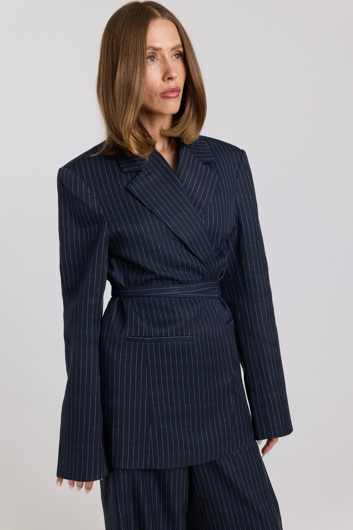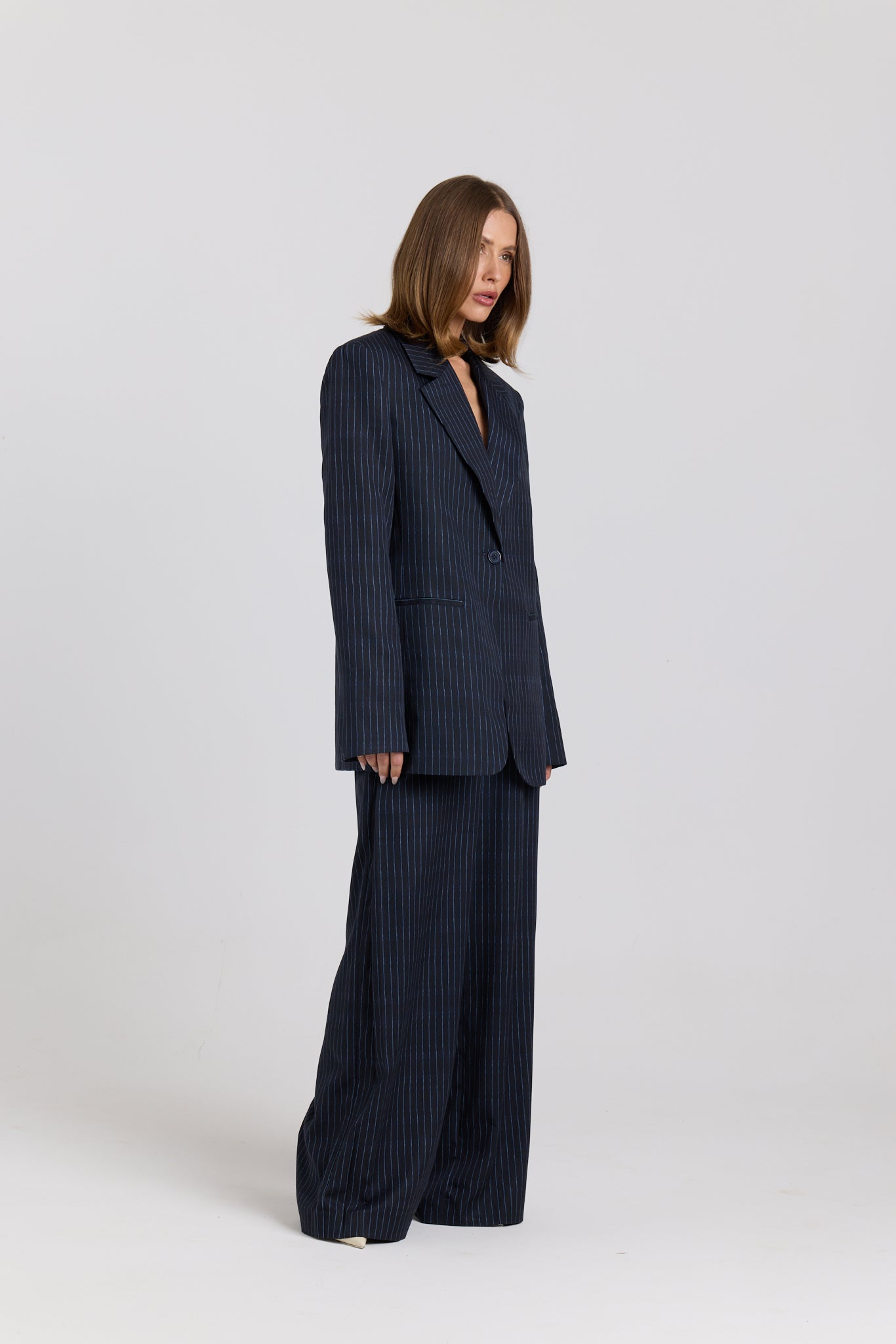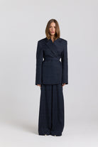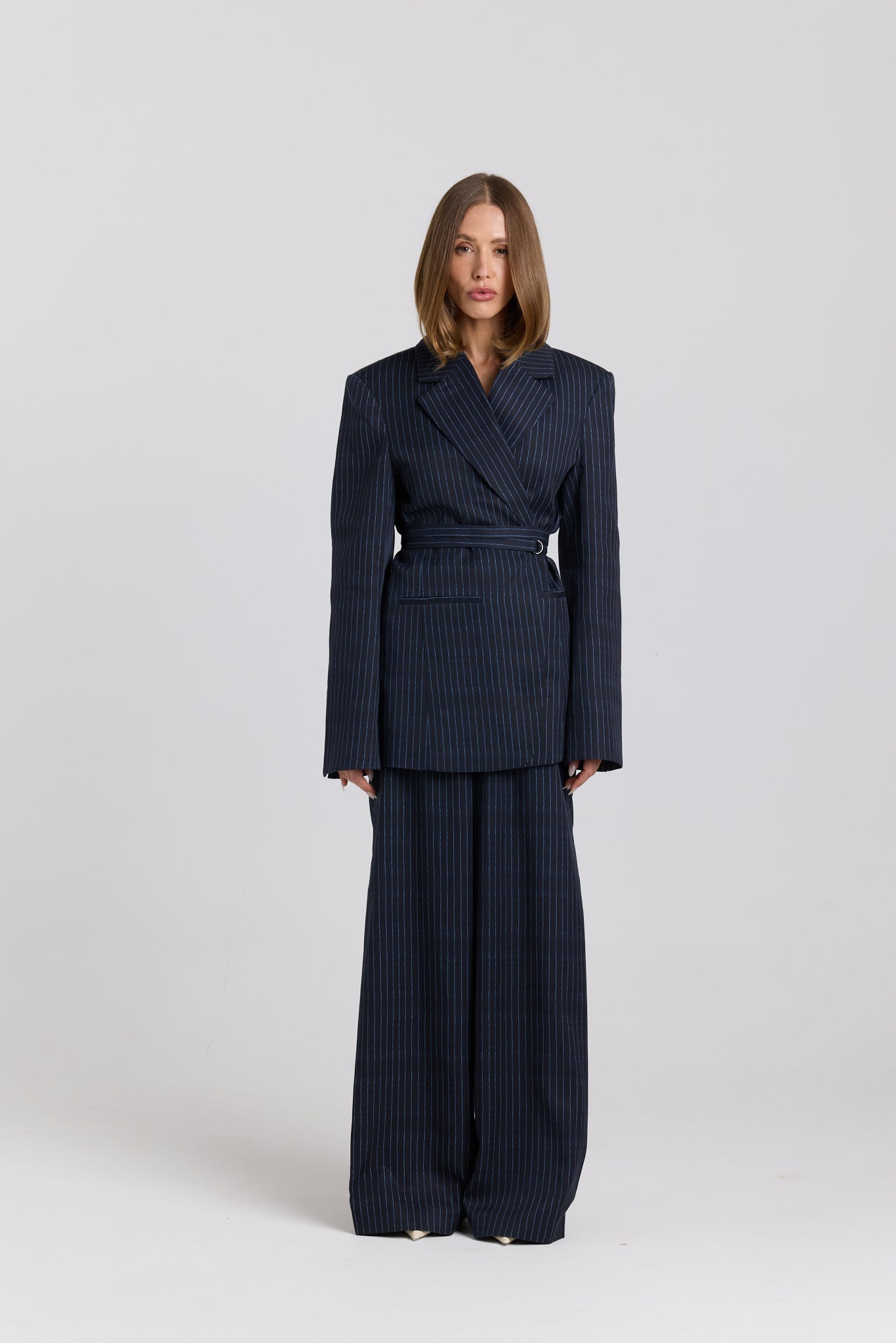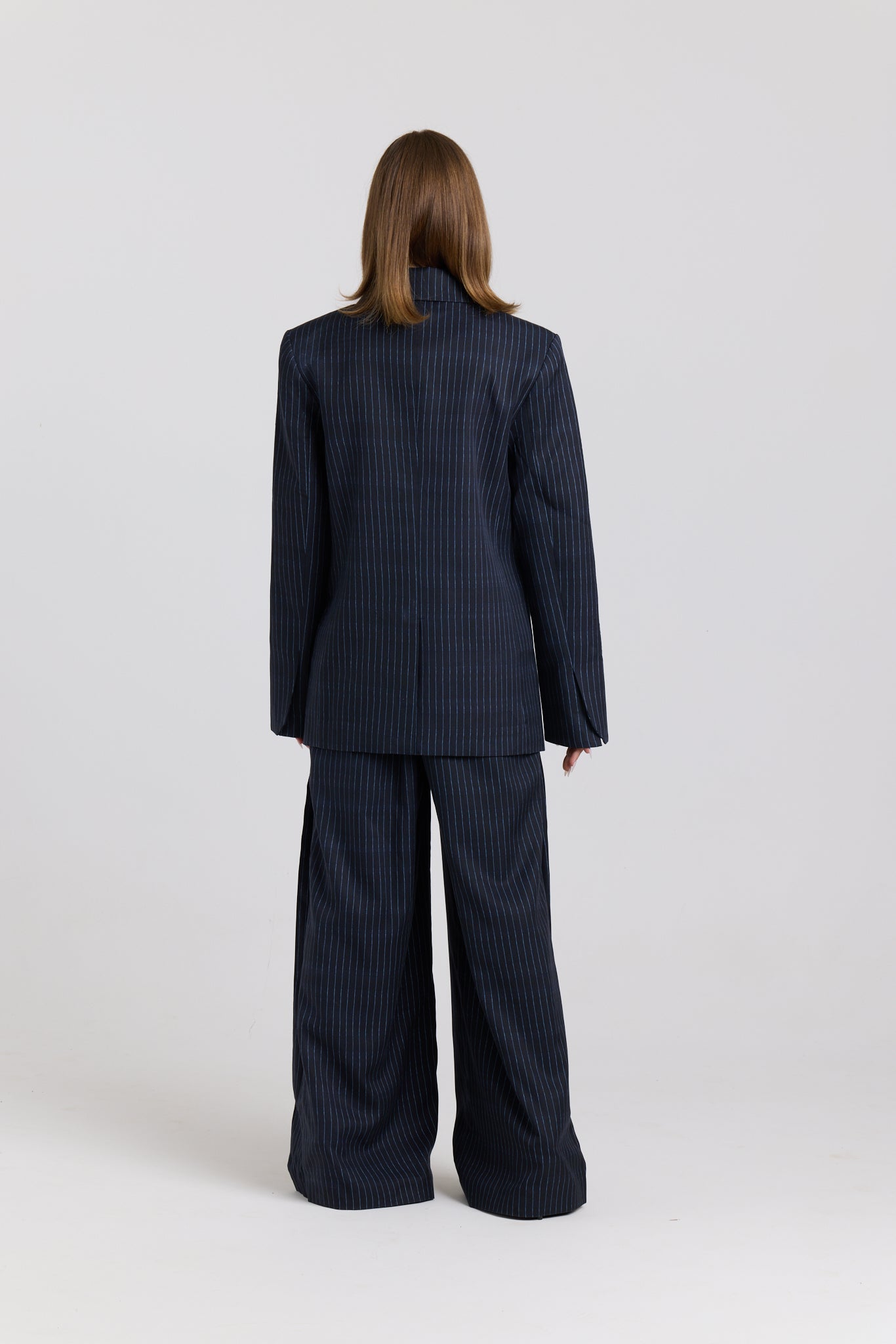 The Santorini Blazer is a modern wardrobe essential, reimagined through hand painted art. Featuring MAKU’s hand painted pin stripe this suit has been a labour of love. Inspired by the movement of ocean swells, this piece balances structure with softness.