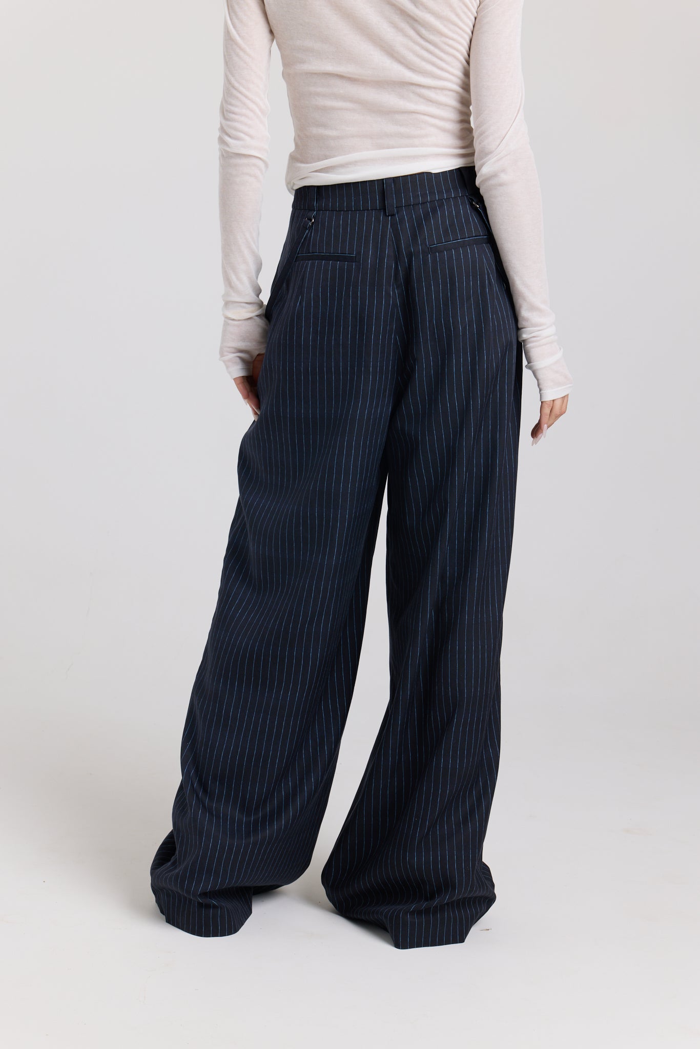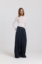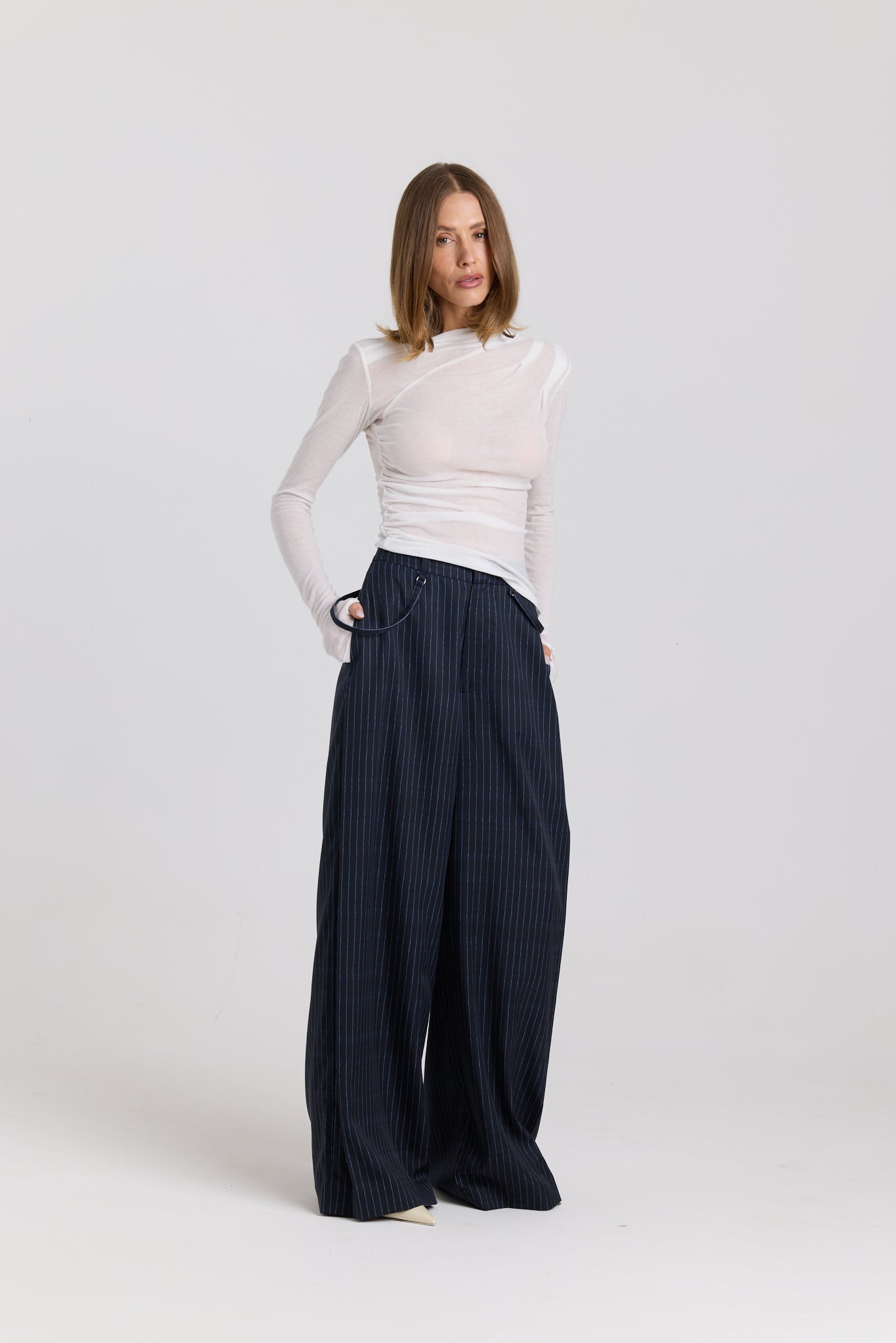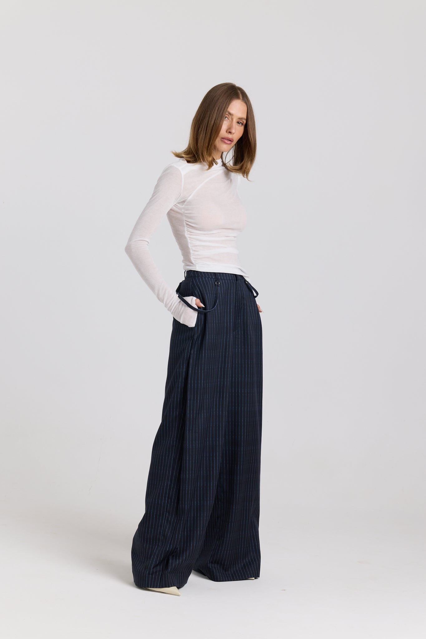 These trousers are intentionally long and designed to be worn with heels for a fluid, elongated silhouette.