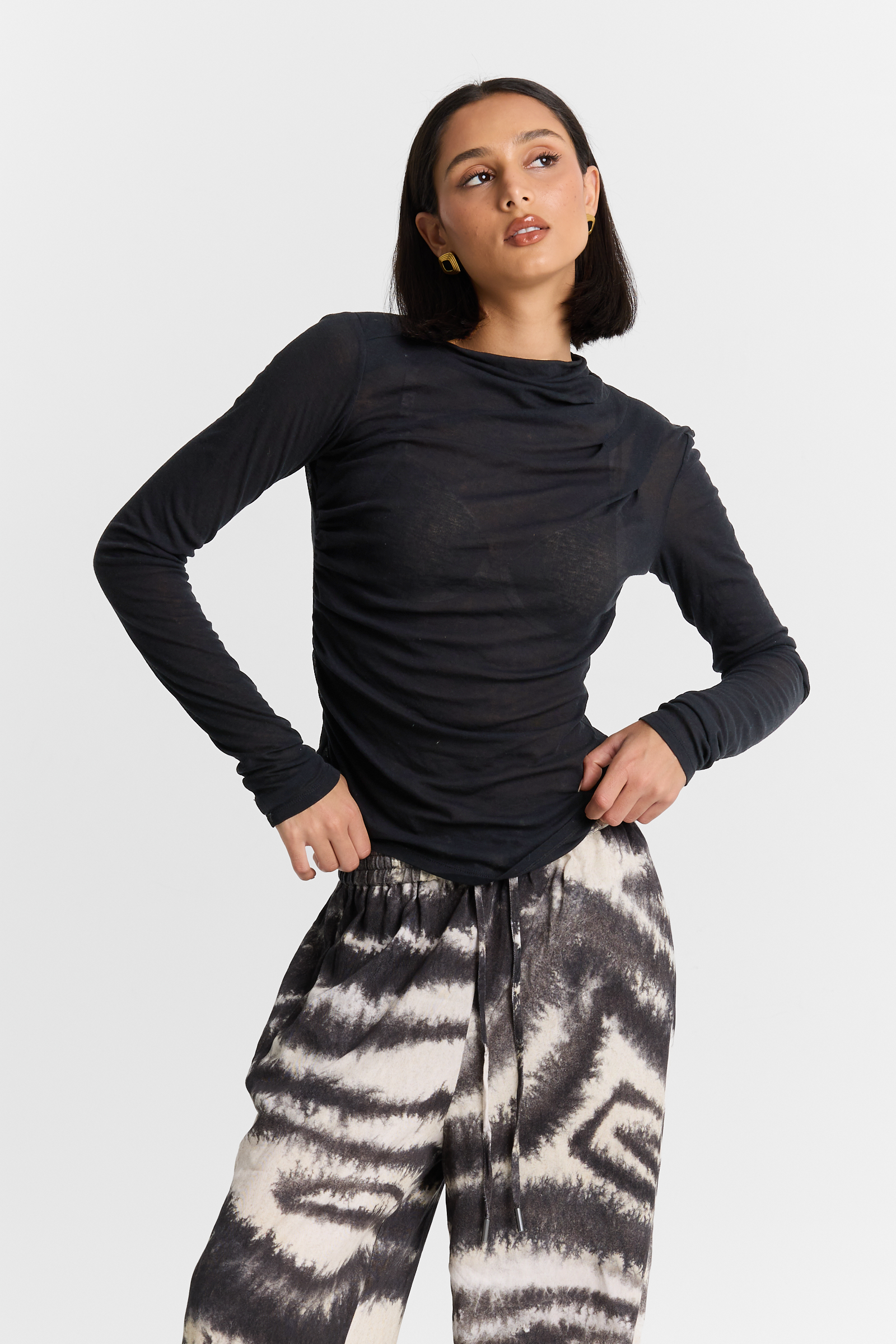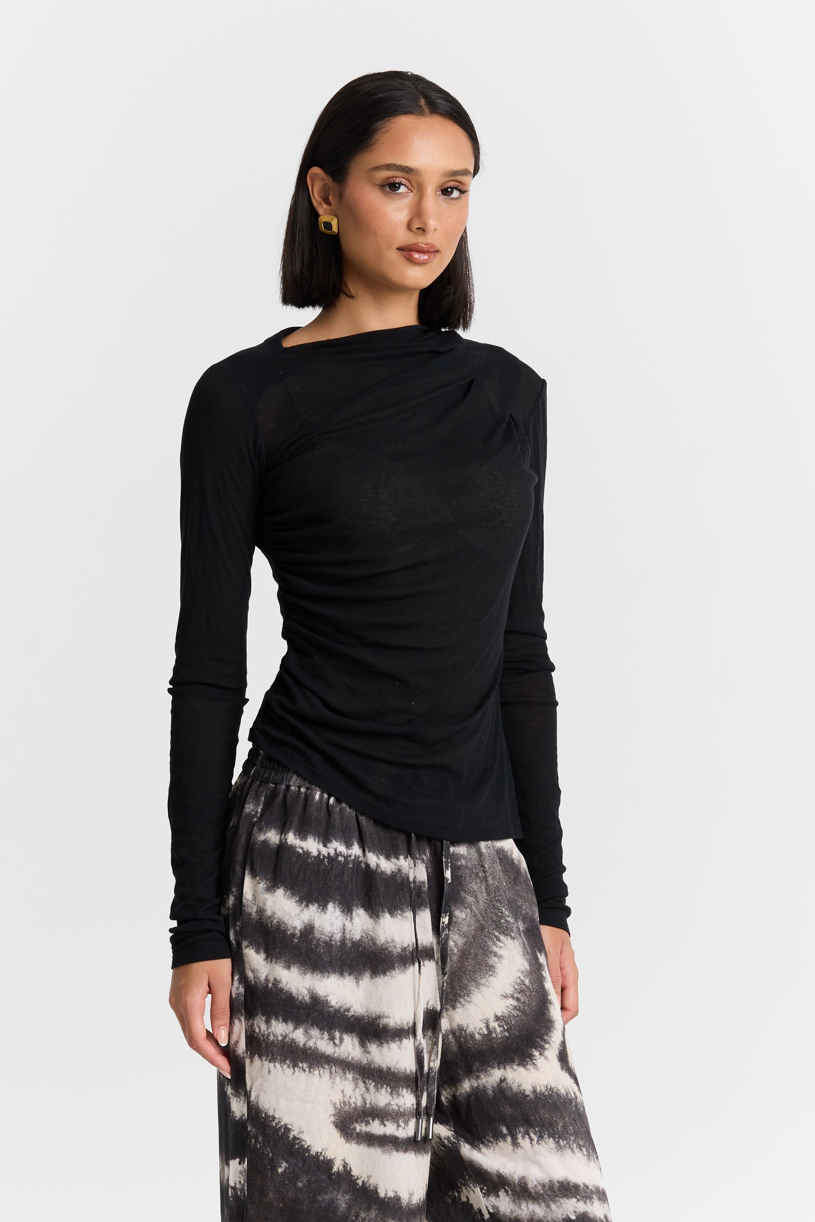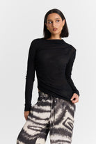 The Semi Sheer Del Mar Long Sleeve is defined by soft ruching through the waist and delicate detailing at the shoulder, creating an effortless asymmetrical drape across the body. Cut from superfine cotton jersey, it offers a lightweight, refined feel with a fluid silhouette designed to move beautifully and elevate everyday dressing.