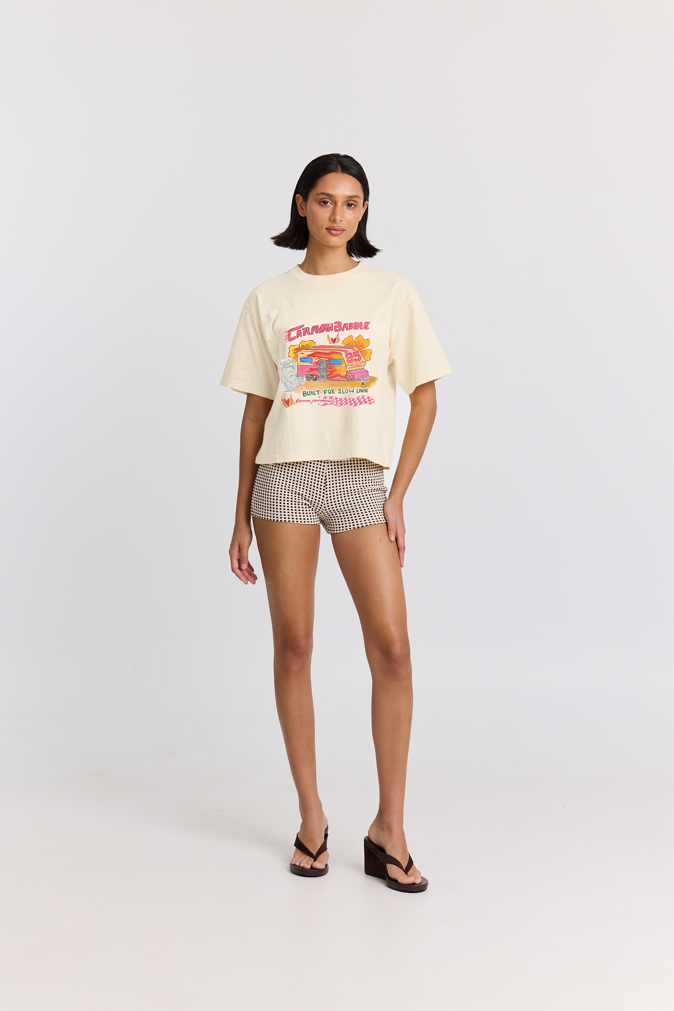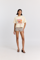 A relaxed, slightly cropped fit that sits just below the belly button. Crafted in brushed cotton for a soft, vintage-feel finish. Featuring original hand-painted artwork by Maku, printed with long-lasting, colour-fast quality. Easy to wear. Made to collect.